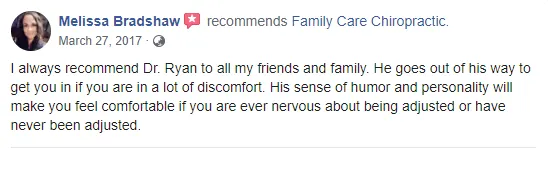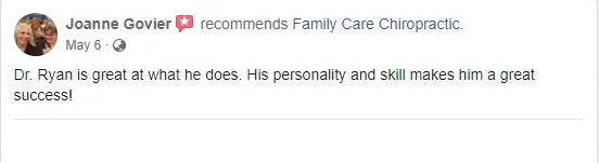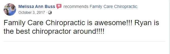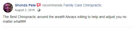 Disclaimer: Procedures and treatments performed by Family Care Chiropractic have an inherent success (and failure) rate. Reviews, testimonials and content on this site should not be interpreted as a statement of efficacy of procedures and treatments performed by Family Care Chiropractic for anyone else.